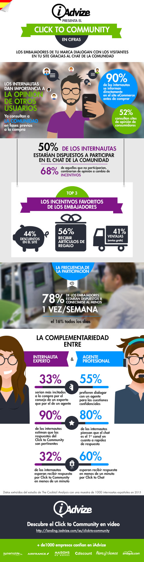 Con la llegada de plataformas integrables a la web, el chat comunitario (community messaging)se vuelve accesible a empresas más pequeñas y con menos infraestructura. Con Howtank los visitantes pueden preguntar a una comunidad (de 100 asesores) seleccionada por la marca. Cuentan con clientes como BlaBlaCar o la compañía de trenes SNCF. iAdvize ya ofrecía los servicio de chat atendido por personal de contacto (click-to-chat) y tiene a la agencia de viaje Marmara como cliente de chat comunitario. Su infografía detalla con datos este concepto.